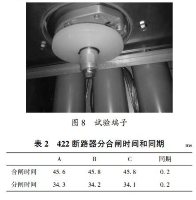 本次實驗選取422斷路器進行機械特性查驗,按圖6進行實驗接線。將4221阻隔開關置于接地方位,將實驗端子接到柜內電纜接口,然后將實驗線接到實驗端子下端進行實驗。實驗端子如圖8所示。422斷路器分合閘時間和同期見表2。
